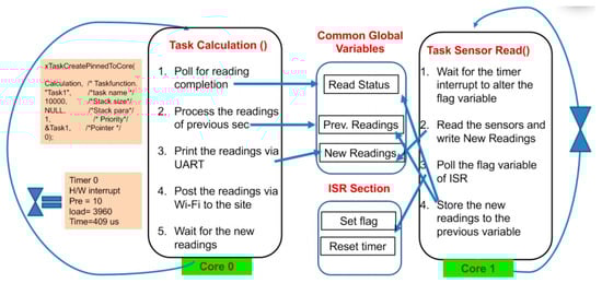 The smart meter must perform both energy and PQ metering in real time, and hence the RTOS is used to handle all the mission-critical activities. This RTOS divides all the functions into smaller tasks, which have their priority and resources assigned to them. This RTOS supports symmetrical multiprocessing (SMP) in which each core shares resources with the other and has a dedicated scheduler for task scheduling. The scheduler in the RTOS makes sure that each task gets enough computational and hardware resources according to the priority and finishes its execution in the allocated timeline. Nevertheless, this needs careful execution because sharing resources can result in deadlocks, spinlocks, and core panics. Therefore, tools like semaphores and mutexes are used to avoid these issues.