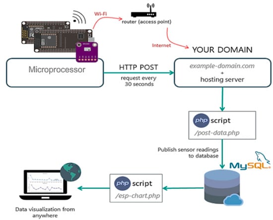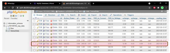 After necessary computations and processing, the PQ smart meter communicates all these quantities to a remote server. This information flow is shown in Figure 6. The meter gets connected to the Wi-Fi access point, sends an HTTP POST request to the website running the PHP script, and waits for acknowledgment. This PHP script captures the meter data, verifies the access credentials, and then transmits the captured data into the SQL database. This database is then later used for visualization by another PHP script on the website to display the data for the user.