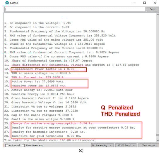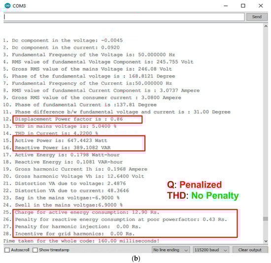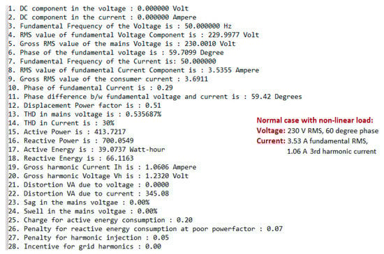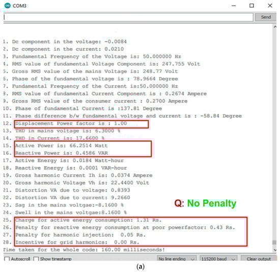 The waveforms of measured voltage and current of these loads, which were captured using a serial plotter, are shown in Figure 15. The phase relationships of the applied voltage and load current of all the loads were found to be satisfactory. These measured raw data were processed, and all 28 PQ parameters were computed as explained in Section 3 and Section 4. The parameters estimated using the smart meter were displayed on a monitor locally, as shown in Figure 16. The lamp was neither inductive nor nonlinear, and, hence, the estimated power factor was in unity and there were no additional penalties/incentives for this load. The overall computation time was around 160 ms, which indicates that the monitoring could be performed online without loss of data. The domestic iron, which was an inductive load, was penalized for its poor power factor. Since the grid voltage was sinusoidal and the load was also linear, the penalty and incentive for harmonic distortion were zero.