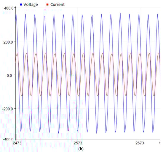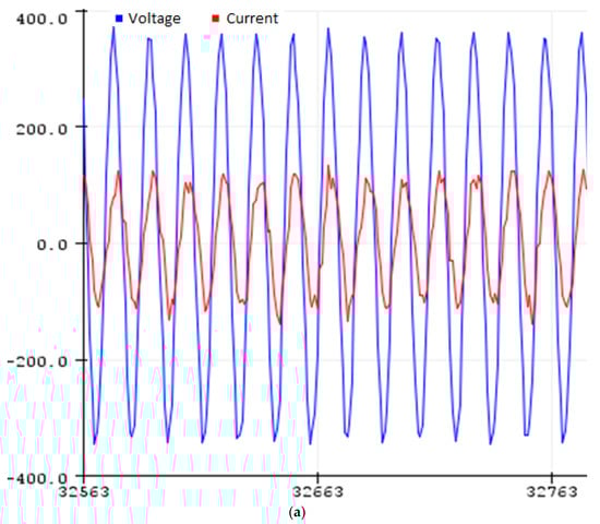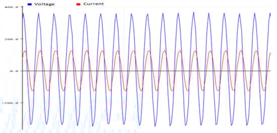 The meter was connected to monitor a 750 W electric iron box load to test the waveshape and the phase relationship. The load was linear and slightly inductive. The code was loaded to the MCU to visualize the voltage and current readings on the serial terminal of a computer, which is shown in Figure 12. It can be noticed from the voltage and current waveforms that the current lagged the voltage and was not contaminated with noise.