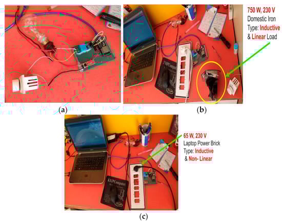Hardware setups with three different loads: an (a) incandescent lamp, (b) electric iron box, and (c) laptop charger.