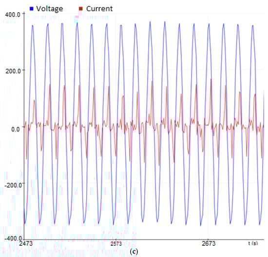 Voltage and current of three different loads: an (a) incandescent lamp, (b) electric iron box, and (c) laptop charger.