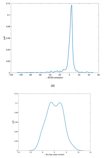 - Off-line Computations (generating base distributions and objective function data from metamodel): Obtain independently distributed samples , Nsamp for metamodel uncertainty (where represents for BTEX emission or for dry gas water content) and decision variables x with uniform distribution between upper and lower bounds. These samples are used to generate the design prior density function using kernel density estimation (KDE). Calculate the objective function (and the probabilistic constraint) for each sample. For example, the sampled error is used to generate objective function for estimated BTEX emission as:Similar estimation is also undertaken for dry gas water content .