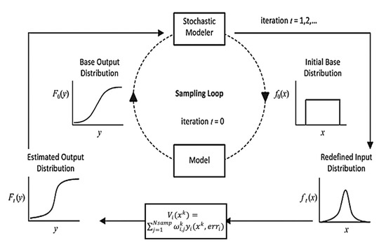 - At each iteration k, the decision variables (in the first iteration, the initial value of decision variables is given), define a narrow normal distribution around this point (see Figure 6) and draw samples of from it. Use samples to generate the design distribution using KDE. Estimate the objective functions and constraint (expected value E) using the following reweighting formula:whereand sastisfy