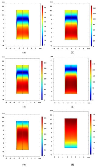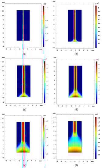 Arc conductivity is an important performance indicator for measuring the arc extinction and the presence of energy breakpoints. Therefore, in this simulation, the performance index is solved by previously established governance equations and cloud diagrams are drawn, which are shown in Figure 6.