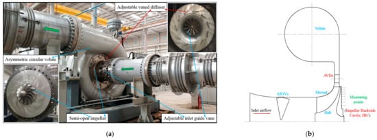 Site map and geometric structure of the research object: (a) the experimental compressor and main components; (b) the geometry of stage and IBC.