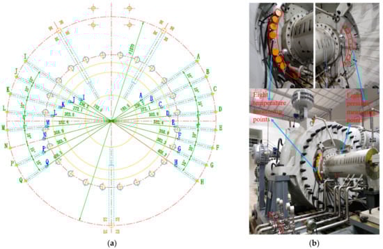 According to the equal area method, eight static pressure measuring points and eight static temperature measuring points are densely arranged on the static wall surface of IBC, and the radii of measuring points are determined to be 193.5, 236.2, 272.1, 303.8, 332.4, 358.9, 383.3 and 406.3 mm. Each radius has a pressure measuring hole and a temperature measuring hole, the specific measuring point positions are shown in Figure 2a. The 16 measuring points are respectively led out to the circumference of the impeller backside with a radius of 535 mm through the corresponding internal channels. The eight marked points A, B, C, D, E, F, G and H on the right are the lead-out positions of the eight pressure measuring holes. The eight marked points I, J, K, L, M, N, P and Q on the left are the lead-out positions of the 8 temperature measuring holes. The specific correspondence is shown in Table 2 and Figure 3, which also includes the gap ratio at each measuring point in the corresponding simplified dynamic and static disk model. The pressure tubes are connected to the remote PSI pressure scanning system through the eight marked points on the right, and the thermal resistance lead wires are connected to the remote temperature transmitter through the eight marked points on the left, which realize the remote transmission of pneumatic parameters in the measurement site of IBC as Figure 2b showed.