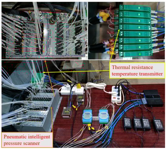 The overall structure of the entire test system can be roughly divided into three layers. The first layer is the field data collection and the feedback of the control valve signal, including total pressure probe combs and WRN thermocouple total temperature probe combs for inlet and outlet pipes, UNIK5000 pressure sensors and WZPK thermal resistances PT100 between the flow parts, annubar flowmeter, vibration sensor, non-contact torque meter and valve opening. The second layer is the data processing and control system, which uses the PLC data acquisition management system to process, analyze, alarm and complete related adjustment and control of the sensor feedback signal. The third layer is remote monitoring, which uses transmission media such as optical fiber and twisted pair to transmit the processed signal to the host computer. For the measurement of static pressure and static temperature measurement points at different radii on the static wall of IBC, Model 9216 Pneumatic Intelligent Pressure Scanners are selected to directly transmit the static pressure signal to PSI9000 pressure acquisition system through the pressure pipe. Three-wire embedded thermal resistance, thermal resistance temperature transmitter, and PLC data acquisition module are selected to connect the static temperature signal to the host computer. The relevant parts of the measurement equipment are shown in Figure 4.