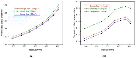 (2) Under AVDs’ design angle, the static pressure at each position on the static wall of the IBC increases with the decrease of the flow, and the static temperature at each position rises as the flow decreases. The large radius is more obvious than the small radius, resulting in the radial static pressure and static temperature gradient both increase with the decrease of flow.