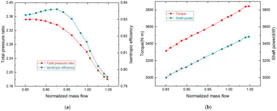 Characteristic curve of centrifugal compressor: (a) total pressure ratio and isentropic efficiency; (b) torque and shaft power.
