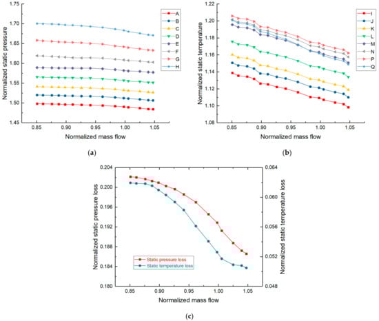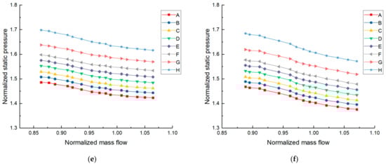 Figure 7 shows the dimensionless static pressure or static temperature and respective loss characteristic curves at different radii on the static wall of IBC under AVDs’ design angle. As described in 4.1, the static pressure of the cavity at each operating point in Figure 7a gradually decreases along the decreasing radius (H→A), and the static temperature of the cavity at each operating point in Figure 7b gradually rises along the direction of increasing radius (I→P) but drops at point (Q) near the coupling between the impeller outlet and the cavity inlet. The dimensionless static pressure loss in Figure 7c is the ratio of the static pressure loss from point H to point A, and compressor inlet total pressure experimental value, which essentially reflect the pressure loss of airflow in the direction of centripetal movement along the decreasing radius, and the specific formula expressions are as follows: