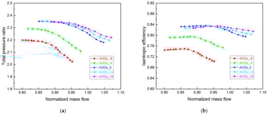Figure 8 shows the experimental characteristic curves of total pressure ratio, isentropic efficiency, torque, and shaft power under variable AVDs’ angles (−8°, −4°, 0°, +4° and +8°). As the angle of AVDs decreases, the total pressure ratio and efficiency characteristic curves move to the lower left, and as the angle of AVDs increases, the total pressure ratio and efficiency characteristic curves mainly move to the right. Because the diffuser channel area under the negative diffuser angle is reduced, it is suitable for small flow conditions, and the compressor stall operating point moves to the left, which is opposite in the situation of the positive angle.