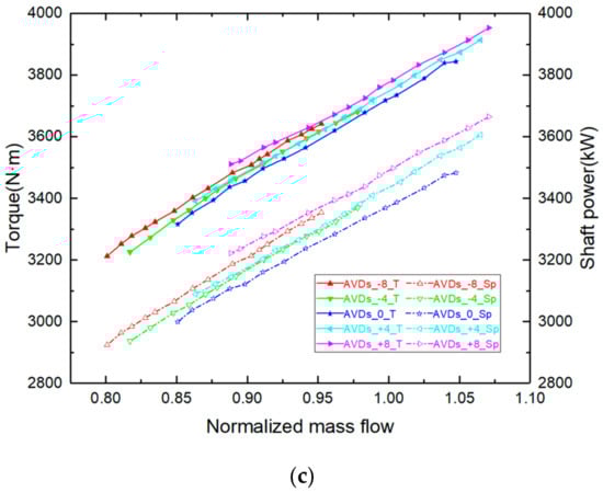 When the angle of AVDs decreases or increases, the torque and shaft power at the same flow both increase slightly in Figure 8c, and the change intensifies with the increase of the angle change. Because the higher the degree of mismatch between the blade inlet installation angle and the design inlet airflow angle, the greater the impact loss of the leading edge of the diffuser blade, and at the same time, it induces that the matching degree between the upstream impeller and AVDs becomes worse, resulting in more power consumption.