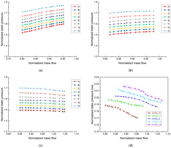 Figure 9 shows the dimensionless static pressure and its loss characteristic curves at different radii on the static wall of IBC under variable AVDs’ angles (−8°, −4°, 0°, +4° and +8°). Under the negative angle of AVDs such as in Figure 9a,b, the static pressure characteristic curve at each position moves to the upper left. Because the air impact point (maximum static pressure point) at the leading edge of the blade under the negative angle moves to the suction surface of the diffuser blade, the static pressure of the gap between the impeller outlet and the diffuser inlet increases locally, and the static pressure in the cavity increases integrally [52], which is opposite in the situation of the positive angle such as in Figure 9e,f. To sum up, the static pressure at each position decreases with the increase of AVDs’ angle. As the angle of AVDs increases, the static pressure loss characteristic curve from point H to point A of the IBC moves to the upper right in Figure 9d. Because with the increase of AVDs’ angle, the distance between the front edge of AVDs blade and the outer edge of the IBC is shortened, the coupling relationship between AVDs and IBC is closer, and the airflow is diverted from the impeller outlet to the diffuser channel in advance, resulting in the amount of gas exchange at the outer edge of the cavity is reduced. Although the mainstream flow remains unchanged, but the flow into the cavity decreases. Combining the analysis in Section 4.2, it can be inferred that the static pressure loss from point H to point A of the IBC increases with the increase of the inlet installation angle of AVDs, and increases with the decrease of the mainstream flow under each AVDs’ angle.