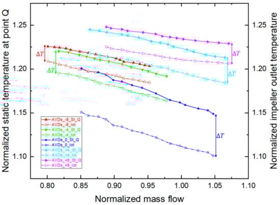 Figure 10 shows the experimental characteristic curves of the dimensionless static temperature at point Q of the IBC and impeller outlet temperature under variable AVDs’ angles (−8°, −4°, 0°, +4° and +8°). Both characteristic lines move to the upper left as the diffuser angle decreases, and move to the upper right as the diffuser angle increases. The temperature difference between them drops with the increase in the degree of change in the angle of AVDs, leading to the air-cooling effect is weakened.