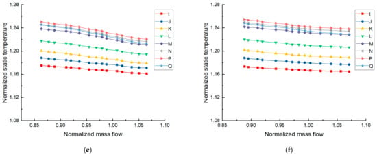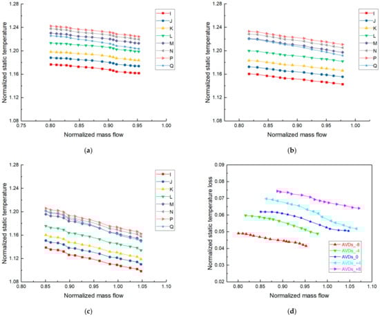 Figure 11 shows the dimensionless static temperature and its loss characteristic curves at different radii on the static wall of IBC under variable AVDs’ angles (−8°, −4°, 0°, +4° and +8°). Under the negative angle of AVDs such as in Figure 11a,b, the static temperature characteristic curve at each position moves to the upper left, and under the positive angle of AVDs such as in Figure 11e,f, the static temperature characteristic curve at each position moves to the upper right. The static temperature at each position rises with the increase of the change degree of AVDs’ angle. Because the air-cooling effect is weakened but the effect of wind resistance and temperature rise is basically unaffected. As the angle of AVDs increases, the static temperature loss characteristic curve from point Q to point I of IBC moves to the upper right in Figure 11d. Similar to the analysis of the static pressure loss from point H to point A of the IBC, although the mainstream flow is unchanged, but the flow in the cavity decreases. Combining the analysis in Section 4.2, it can be inferred that the static temperature loss from point Q to point I of IBC increases as AVDs’ angle increases and increases as the mainstream flow decreases under each AVDs’ angle.