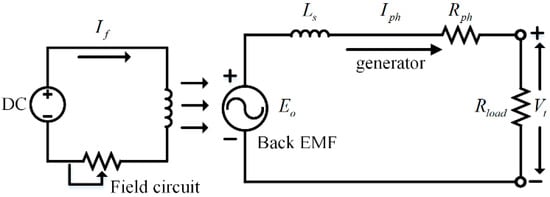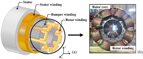Wound rotor synchronous machines (WRSMs) are most commonly used because of their advantages, such as simple control, cost efficiency, and stable operation []. In particular, when operated as generators, they can maintain the rated voltage as the load fluctuates while coping with the change in operation characteristics []. In fact, wound rotor synchronous generators (WRSGs) are commonly used in large-capacity generation of hydropower.