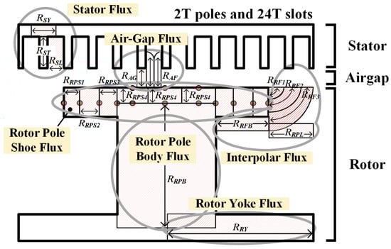 Therefore, it is important to configure a suitable reluctance circuit in each area []. The section of the rotor pole and inter-polar is divided into six sections. The reluctances in each section are as follows:
