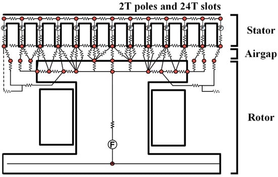 In general, the core material used in an electrical machine has a nonlinear property and, to analyze this nonlinearity, a nonlinear MEC is constructed. Considering the periodic properties, it is expressed as a combination of 2T poles and 24T slots, where T is the number of periods. The paths that the magnetic flux passes through are divided into stator, rotor, air-gap, and inter-polar regions. A nonlinear MEC comprising reluctance in each region can be seen in Figure 2 and Figure 3. For simple nonlinear analysis, the damper windings of the rotor are neglected.