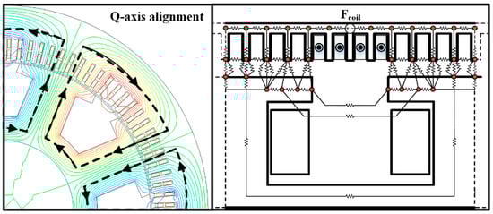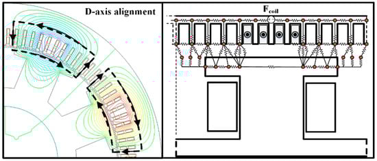 The magnetic flux line and reluctance circuit configuration when the rotor is on the q axis and d axis are shown in Figure 4 and Figure 5, respectively. It is evident that the magnetic flux path depends on the rotor position, and the MEC is also different. The leakage flux between the slot and tooth, between the windings to which the current is applied, is neglected and is similar to the magnitude of the reluctance described in the previous section. The pole body reluctance of the d axis should be set to the opposite cross-sectional area and length. Using the point of the initial specific permeability in an unsaturated core, the reluctance of the core was calculated.