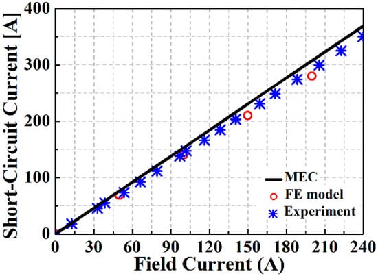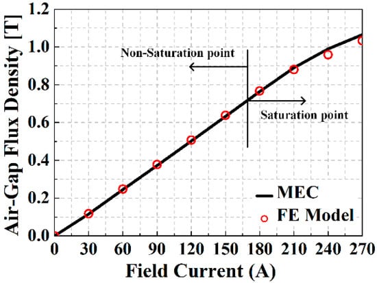In Table 2, the MEC, FEM, and experimental results of the electrical circuit parameters are shown. A field current of 215 A was applied to the rotor winding, and the inductance required for the power generation characteristics was calculated using the permeability calculated by the nonlinear MEC. The inductance calculated by the MEC method contains a significant error compared to the FEM, which is a reasonable result because it is difficult to accurately represent the leakage path in the MEC method. The maximum size of the air-gap flux density according to the field current is compared with the FEM result and is shown in Figure 9. In addition, the waveform of the air-gap magnetic flux density, when a field current of 150 A is applied, can be seen in Figure 10, and the linkage flux results are shown in Figure 11. In the open circuit, when driven at a constant speed, the back EMF can be measured according to the magnitude of the field current, and the experimental results are compared with the FEM and MEC as shown in Figure 12. Figure 13 shows the short-circuit current of the generator and is compared with the FEM, MEC, and experimental data. As a result of the comparison of the magnitude of the short-circuit current depending on the magnitude of the field current, a small error was confirmed in the inductance obtained using the value of the initial relative permeability. The generation characteristic analysis at the rated speed is shown in Figure 14. A comparison of the MEC and FE results shows that the rated output point is accompanied by a small error. It seems that the error is the result of the electromagnetic parameters error. Nevertheless, it shows an insignificant error in the region where the voltage regulation decreases (VR < 15%). From a comparison with the MEC, FE, and experimental results, the MEC predictions are validated.