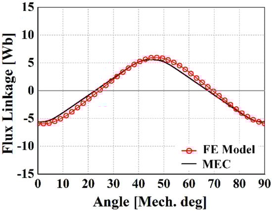 In Figure 6b, the inductance according to the rotor position is shown. The inductance of one-phase winding can be obtained from the magnetic flux obtained using the axis reluctance network. The stator leakage inductance was neglected. The axis inductance of the one-phase winding is as follows: