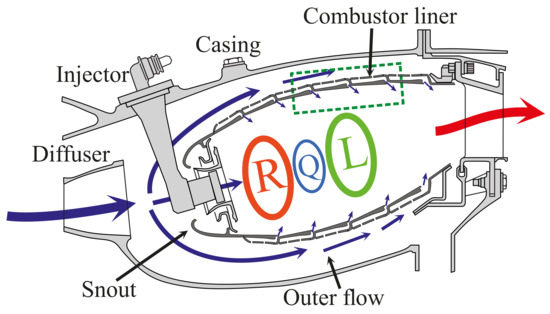 The continuous development of aero-gas turbines leads to constant improvements that benefit air passengers and the environment. A commonly used combustion technology to reduce the formation of is the RQL combustor, describing the three major combustion regions—Rich, Quench and Lean—in an annular combustor. As shown in Figure 1, the air from the compressor is divided into two major flow paths. A small amount of the compressor air is used to create an air-assisted fuel spray, providing a minimal amount air for burning that fuel spray in a rich environment (red arrow). The remaining air is guided around the combustor liner and used for consecutive mixing, dilution and, mainly, for the cooling of the liner walls.