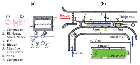 Test facility at ITS showing the hot gas path in red and the coolant path in blue. (a) Infrastructure (with object labels), (b) test section with ① turbulence grid ② meshes, screens and turbulence grid ③ glass frame inset ④ light sheet ⑤ specimen with effusion cooling pattern ⑥ specimen with impingement cooling pattern ⑦ PEEK frame around cavity.