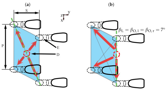 (a) Arrangement of each impingement cooling hole to the effusion cooling holes. Red arrows show theoretical exit paths and distance to the next effusion cooling hole. The blue parallelogram shows the wetted area before the coolant is ejected. (b) Misaligned setup MALO05. Cut planes for later evaluation shown in green.