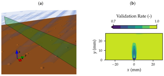 The time distance for the double images is chosen for each case to optimize validation rate between 5–10 μs. The resulting validation rates are shown for a worst case scenario with high Reynolds number at large cavity heights in the center plane (this yields the maximum span of velocities in the domain) in Figure 4b. Validation rates are in unity in most of the domain; however, in the core jet, some evaluations fail, due to high velocity and thus, high particle displacement. Before final processing, these remaining outliers are interpolated, using a spatial linear approach at each time step. Afterwards, only points with a validation rate of unity are considered—this removes points at borders where the convex hull of valid data changes with time and points inside the domain if interpolation errors occur, yielding the most conservative approach. The data can then be used for transient analysis or 3D interpolation and visualization.