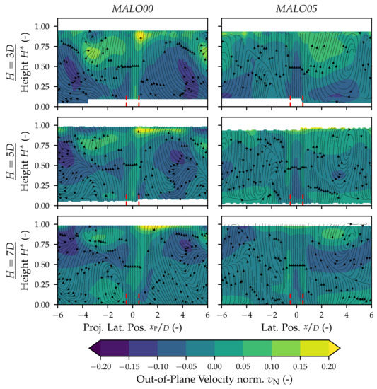 To further analyze the interaction between the impinging jet and the effusion hole inflow, a cutting plane is placed through the geometric centers of the two holes. Thus, for MALO00, this leads to a plane at an angle of š to the y-normal plane, while for the misaligned cases, this resembles a y-normal plane. The resulting planes are shown in Figure 3 in green. For the rotated planes, the lateral coordinate, in-plane and out-of-plane velocities are recomputed via projection. The planar data are depicted in Figure 7 for the low Reynolds number . The high Reynolds number data are shown in Figure A3 and again are not discussed in detail, due to high similarity. The plot shows the in-plane velocity using streamlines and the out-of-plane velocity using contours. All velocities are normalized, using the maximum velocity magnitude for a given plane.