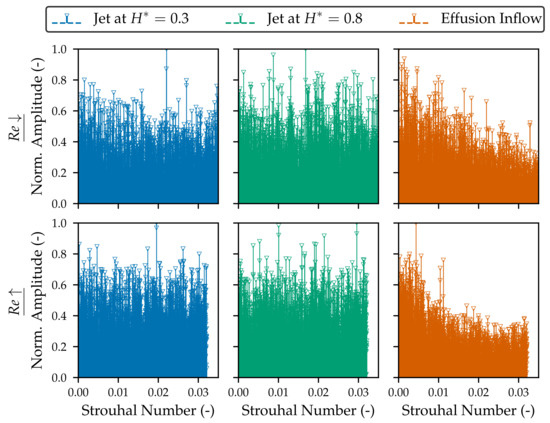 with the computed jet exit velocity ; see Table 2. The amplitudes are normalized with the maximum amplitude in the spectrum. The resulting data are shown in Figure 8 for the reference case , MALO00. Since the jet center plane does not intersect the effusion hole inflow plane, two different planes are selected for the analysis of the different spectra. All spectra are subject to noise for several reasons: the flow is turbulent, no main external excitation exists, and due to the Nyquist frequency at Hz, parts of the spectrum are subject to either the mirror of shift frequencies (especially higher frequency turbulence may carry substantial energy). Additionally, any non-true periodic parts of the input signals cannot be represented, due to infinite-length time domain representation of the FFT approach. The jet spectra are similar for both Reynolds numbers. At the lower location, few distinct peaks exist, allowing the detection of a jet fluctuation Strouhal number. With increasing jet travel downstream, more peaks occur, and the jet movement increases in complexity. Jet fluctuation Strouhal numbers are expected to be in the order of . The effusion inflow spectrum shows a stronger skew to lower Strouhal numbers. This skew increases with the increase in the jet Reynolds number.