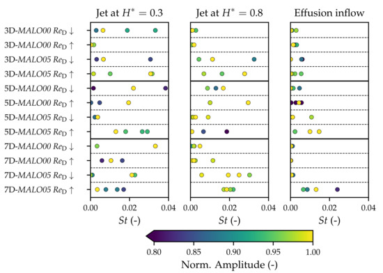 These spectra were analyzed for all configurations at the previously described positions. For each configuration and location, the four Strouhal numbers with the highest normalized (relative to the maximum for each configuration and each position) amplitudes are extracted and plotted in Figure 9, with the color showing the normalized amplitude.