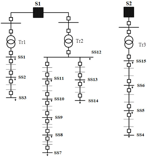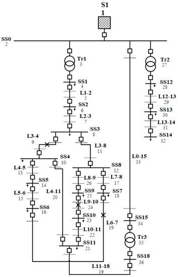 Figure 2 represents the initial circuit of the power distribution network. The distribution network voltage is 10 kV. This network is powered by two different sources—S1 and S2. The voltage of its sources is 110 kV. The distribution network supplies power to 15 buses indicated as N1–N15 in the Figure 2. Transformers, power transmission lines, and load feeders are connected to circuit breakers.