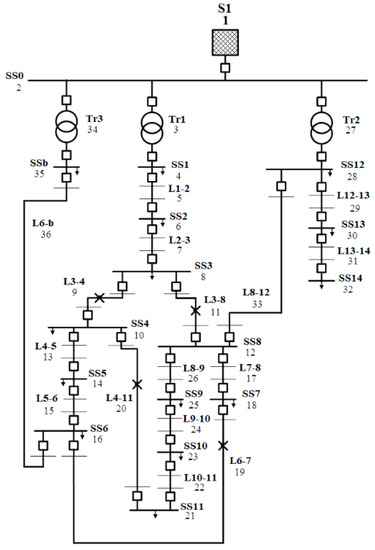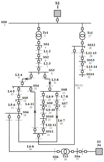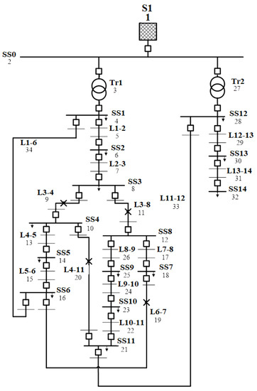 Structure 2 is shown in Figure 4. The structure of the distribution network differs from Structure 1 in that SS6 is powered from SS1 and not from SS0. In this structure, during the normal operation of the distribution network, the backup power transmission lines L3-4, L6-7, L4-11 are in the disconnected state. If a component of the network fails, the latter is reconfigured to restore the serviceability of the substations and provide a reliable power supply to consumers.