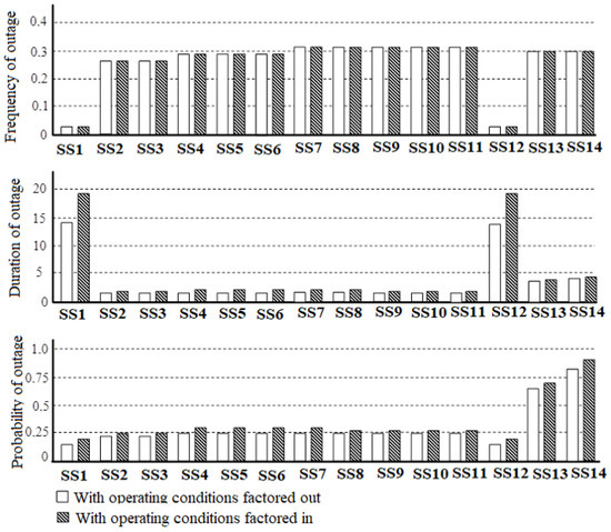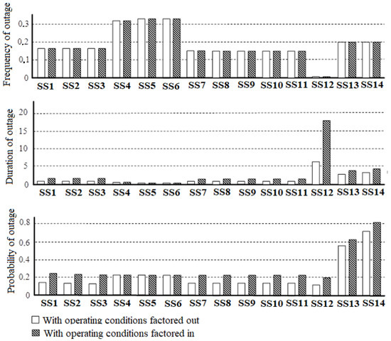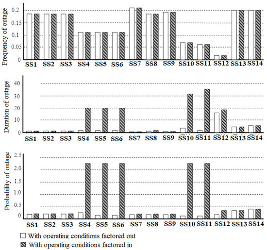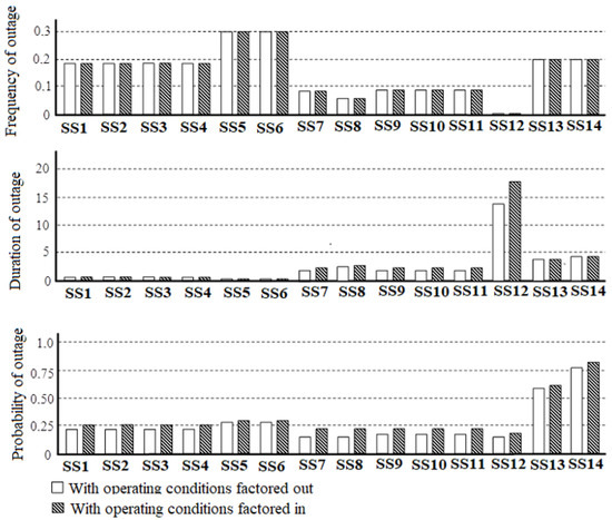 Formulas (1)–(3) were used to perform calculations of system reliability metrics. Table 3 summarizes the results of the calculations in two versions: with the calculations of operating conditions factored out and with the calculations of operating conditions factored in.
