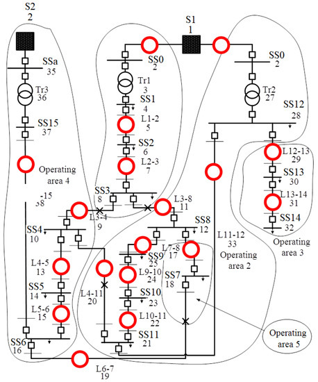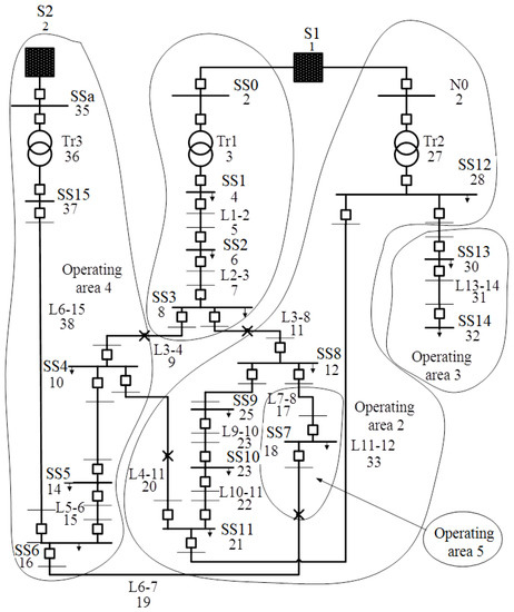 The reconstructed circuit of the power distribution network with operating areas is shown in Figure 12. It should be noted that this distribution network under normal conditions operates as a radial one. In this case, backup distribution lines are disconnected.