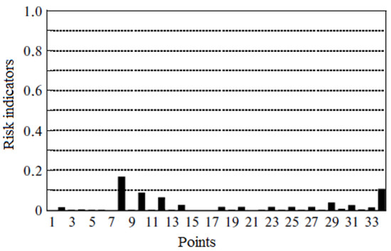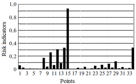 The diagram of risk metrics for the initial network (Figure 14) shows that the failures of buses 8, 10, 12, 14, transformers 34 and, particularly, 15 are dangerous from the security standpoint. The highest risk value assigned to the failure of transformer 15 is due to the fact that the source S2 supplies power to more essential consumers than the source S1, which yields high values of specific damages. The zero risk values for components 7, 16, 17, 21 are explained by the absence of these backup transmission lines in the initial power supply system.