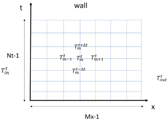 Figure 2 shows the general working procedure of the explicit FE-method. The x-axis is along with the wall thickness, while the y-axis is time. The temperature () at time step t + ∆t is derived directly from the temperature () at the previous time step t. The wall is discretized into Mx-1 elements from the inside to the outside. For convergence, the element size is 1 mm along the x-axis and 0.001 s along the time-axis in this study.