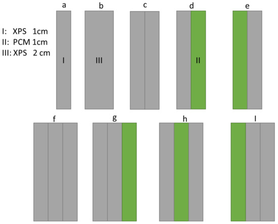 As Figure 3 shows, the experiments include three parts: one layer: a and b; two layers: c (XX), d (XP), and e (PX); three layers: f (XXX), g (XXP), h (XPX), and i (PXX) where P stands for PCM, and X stands for XPS. The sequence of the characters stands for the location of different materials. XPX, for instance, means XPS-PCM-XPS. The location of the PCM layer in the wall varied in the cases of two-layer and three-layer.
