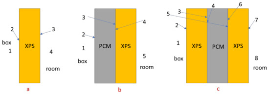 The temperatures at different positions and depths in the wall were measured by using type T thermocouples. The locations of the measured temperatures, numbered from the inside of the box for one layer, two layers, and three layers, are shown in Figure 5. The indication of the numbers of Figure 5b is taken as an example: (1) at the inside of the box in the air space at a half distance between the heating unit and the wall, (2) on the inner surface layer, (3) on the inner layer but the surface facing the outside of the box, (4) on the outer layer but on the surface facing the inside of the box, (5) on the outside layer on the surface facing the outside of the box, (6) in the air at a 5 cm distance from the outside surface facing the office. In the simulation, points 3 and 4 are considered one location, which is defined as a contact surface, and the contact surface properties are taken as a mixture of XPS and PCM. For three layers of Figure 5c, point 3 and point 4 are combined, and point 5 and point 6 are integrated into the simulation.