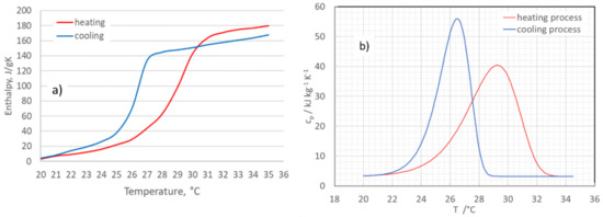 (a) Enthalpy data received from the PCM provider Climator Sweden AB; (b) Specific heat (cp/(kJ/kgK)) of the PCM (Climsel 28) used in this study as a Weibull 2 function of temperature.