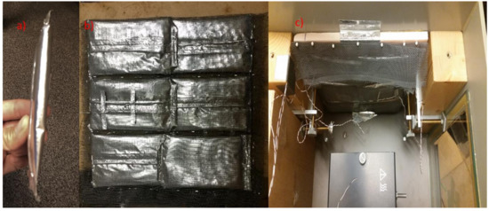 The PCM material purchased is packed in small bags of size 7 cm × 12 cm and a thickness of about 1 cm, as shown in Figure 7a. Six of the bags were enclosed in a thin polymer net (as shown in Figure 7b). Some of the edges are overlapping to reduce the effects of air gaps, which will result in inhomogeneous heat transfer through the surface, which will be discussed in the result Section below. Tiny needles pin the net onto the XPS wall (Figure 7c) in the two-layer experiment. In the simulations, the netted PCM bags were modeled as a uniform PCM layer, with an equivalent thickness of 1 cm.