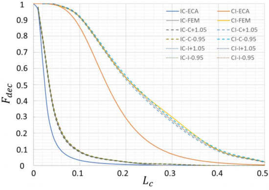 Figure 8 shows the results from both ECA and FEM. Fdec in y-axis is the temperature decrement factor defined as . and are the temperature variation amplitudes on the internal and external surfaces of the wall. Lc in the x-axis is the thickness of the conduction layer. The ratio of Lc and the total thickness of the wall is 0.5. For FEM, the inside temperature is set to 23 °C, while the outside temperature is set to a sinusoidal function as , where w is the angular frequency ω = 2π/T = 7.27 · 10−5 rad/s for one day. The external heat transfer coefficient in the FEM-model is set to be an extremely high value () to obtain an external surface temperature that follows To. The internal surface temperature variation is then obtained based on Equations (2)–(4) by using adiabatic boundary conditions, setting hi = 0. The sensitivity of the conduction and the insulation layer property () on the temperature performance of the decrement is also analyzed and shown in Figure 4. IC-C + 1.05 denotes that for the wall configuration IC mode, with conduction layer property a deviation of +5%; IC-C − 0.95 (−5%) denotes that for the wall configuration IC mode, with conduction layer property a deviation of −5%; IC-I + 1.05 denotes that for the wall configuration IC mode, with insulation layer property a deviation of +5%; IC-I − 0.95 (−5%) denotes that for the wall configuration IC mode, with insulation layer property a deviation of −5%; the validation was the same for the CI mode.