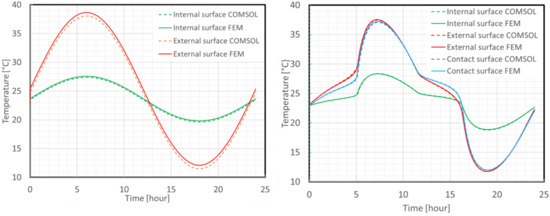 Baghban et al. (2010) [32] have utilized a COMSOL model to simulate a wall system with high-performance materials and concluded that COMSOL Multiphysics has a high potential for building physics simulation tools. This study also uses a COMSOL model to validate the FEM model with wall configurations of a and e shown in Figure 3. A temperature variation of as has been applied. Figure 9 shows the comparison of the results from both FEM and COMSOL. The root mean square between FEM and COMSOL for external and internal surfaces ( ) show the deviation and listed in Table 2, which indicates a good match between the two models regarding the temperatures in different surfaces.