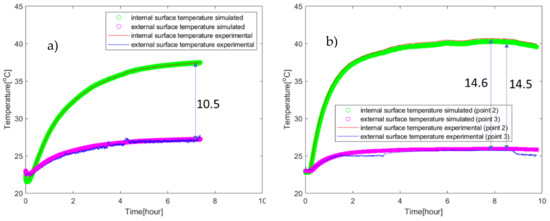 The matching procedure gave a = 18 W/(m2K) and a As shown in Figure 10a, there is a very good match between the simulated and experimental temperatures received in the 1 cm XPS case. = 5.5 W/(m2K), with an RMSE of 0.17 °C and 0.21 °C for the two temperature differences, at the internal and external surfaces, respectively. As expected, we obtain a higher convection coefficient inside the box due to the forced convection of the fan. A comparison was also made with the same convection values for the 2 cm XPS case, i.e., configuration Ib, giving a small increase in the RMSE values to 0.32 °C at the internal surface and 1.27 °C at the external surface respectively, see Figure 10b. In the latter case, which did not happen in case Ia, we see a minor influence in the experimental measurements of the ventilation system in the room turning on and off, expected to have a minor effect on the convection at the external surface of the box, giving a higher RMSE. The good correspondence of the temperature profiles indicates that the simulation tool (ex-FEM), applied in this study, can predict the experimental results well in the XPS cases.