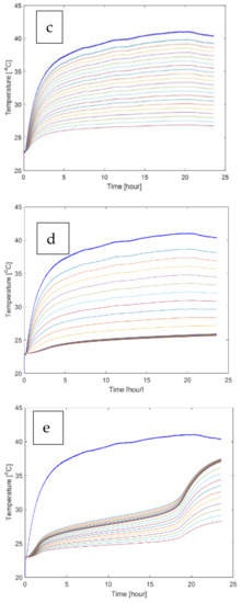 Temperature profiles from simulations for the two-layer configurations c–e. The lumped curves correspond to the temperature profiles over the PCM layer. The blue curve is the air temperature inside the hotbox. The other curves represent a temperature profile at different tenths of the XPS layer.