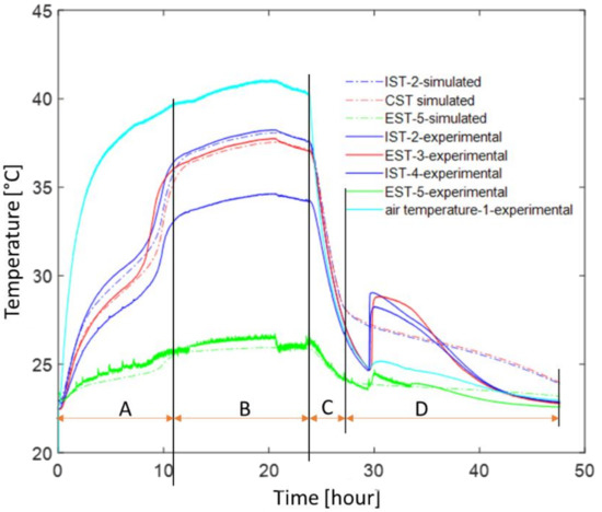 Comparison of temperature profiles of experiment and simulation at different wall locations for case e. IST: Internal surface temperature; CST: contact surface temperature; EST: external surface temperature. A: heating process; B: steady-state process; C: cooling process; D: sub-cooling to end.