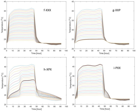 Simulation results of three-layer wall configurations f–i as shown in Figure 3. X: stands for XPS; P: stands for PCM. The lumped curves are temperature profiles over the PCM layer; other curves are temperature profiles over the XPS layer in every tenth of the thickness.