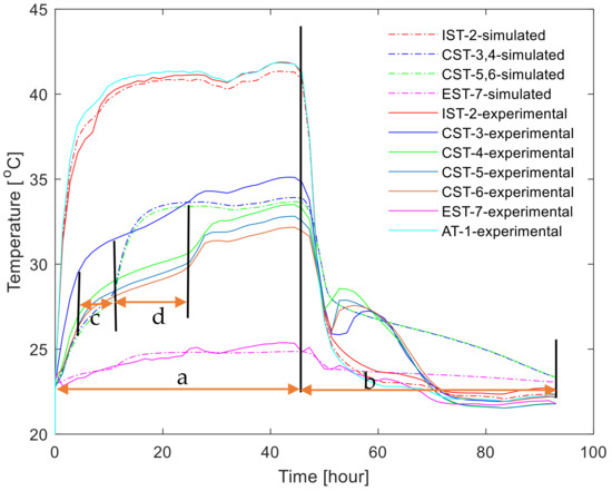 The comparison of the experimental and the simulation results of wall configuration h-XPX are shown in Figure 14. For the heating process, the air temperature inside the hotbox increases rapidly to about 40 °C and then slightly increases and maintains a temperature of about 41 °C before cooling starts. The internal surface temperature from the simulation does not show a phase transition from the two contact surfaces and the external surface temperature. The phase transition from the simulation and experiment is not the same as for the two-layer wall configuration shown in Figure 12. The phase transition from simulation and experiment started at almost the same time. Nonetheless, it ended earlier in the simulation (period c), at about 12 h with a temperature of 28 °C, while experimental results showed an end at about 27 h with 29 °C (period d), possibly caused by an extra thermal resistance between two surfaces challenging to control in simulation.